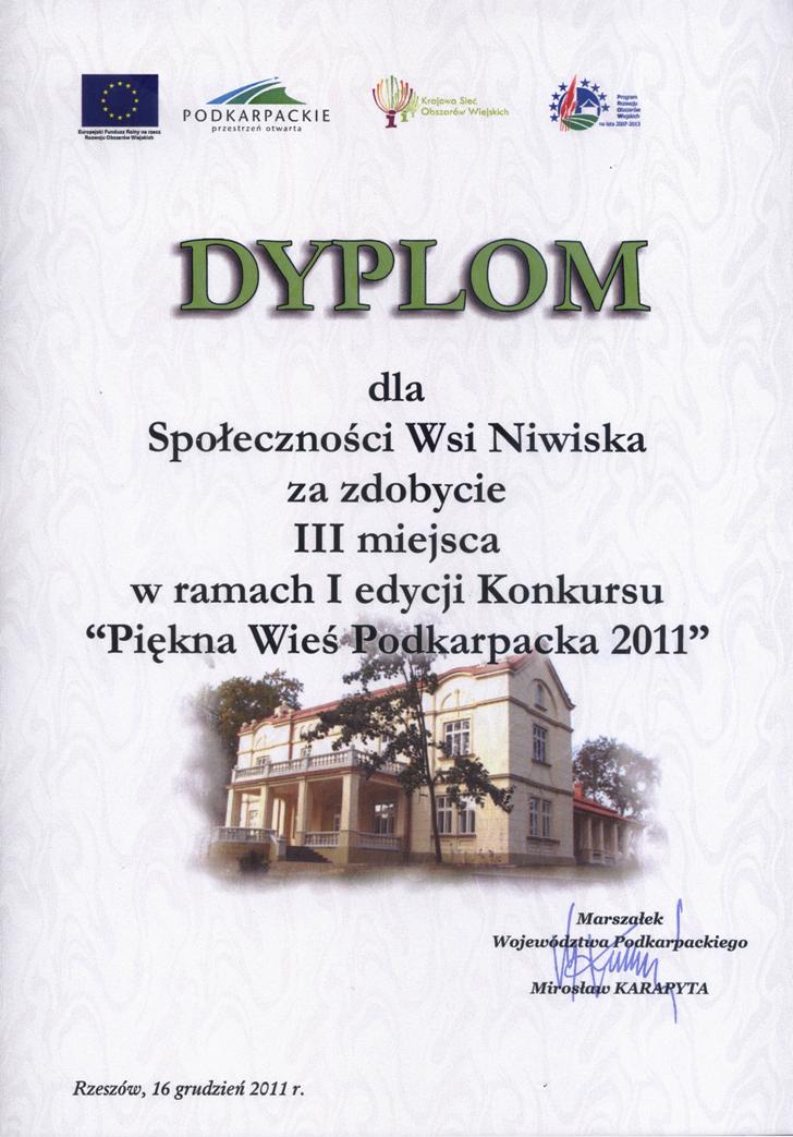 W dniu 16 grudnia w Urzędzie Marszałkowskim Województwa Podkarpackiego odbyło się rozstrzygnięcie konkursu "Piękna Wieś Podkarpacka 2011". Gmina Niwiska zgłosiła do udziału w konkursie wieś NIWISKA poprzez opisanie wsi i dołączenie dokumentacji fotograficznej. Zgodnie z regulaminem w dniu 16.09.2011r. Komisja Konkursowa wytypowała 10 wiosek do wizji lokalnej. Wśród nich były NIWISKA. Wizje lokalne przeprowadzone zostały w październiku.