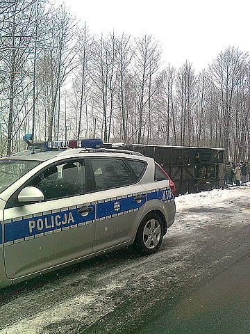 Policjanci pracują na miejscu wypadku, do którego doszło w Trześni. Kierowca autokaru wiozącego dzieci na lodowisko, w czasie wymijania z innym samochodem wpadł w poślizg i wjechał do rowu. Autokar przewrócił się na bok. Do szpitala przewieziono troje dzieci. Ich życiu nie zagraża niebezpieczeństwo.
