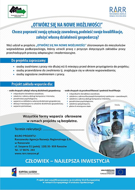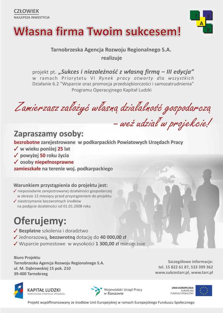 Uprzejmie informujemy, iż Stowarzyszenie na Rzecz Rozwoju i Promocji Podkarpacia „Pro Carpathia” w dniu 3 grudnia 2012 roku otwiera pierwszy nabór Kandydatów do udziału w projekcie pt. „PRACA NA WŁASNY RACHUNEK SZANSĄ WEJŚCIA NA RYNEK PRACY!”, realizowanym w ramach Działania 6.2 Wsparcie i promocja przedsiębiorczości i samozatrudnienia, Programu Operacyjnego Kapitał Ludzki.