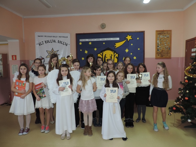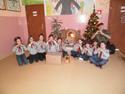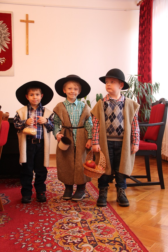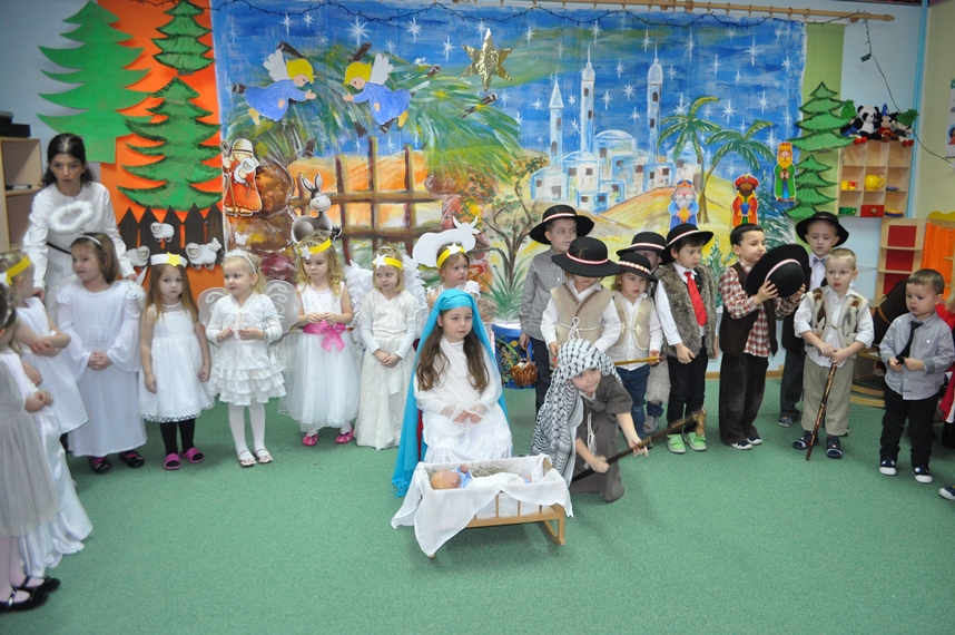 Przedszkolaki przebrane za pasterzy i aniołki ogłosiły wesołą nowinę narodzin Jezusa. Następnie wspólnie ze zgromadzonymi dziećmi i nauczycielami wyśpiewały kolędę „Pójdźmy wszyscy do stajenki”.