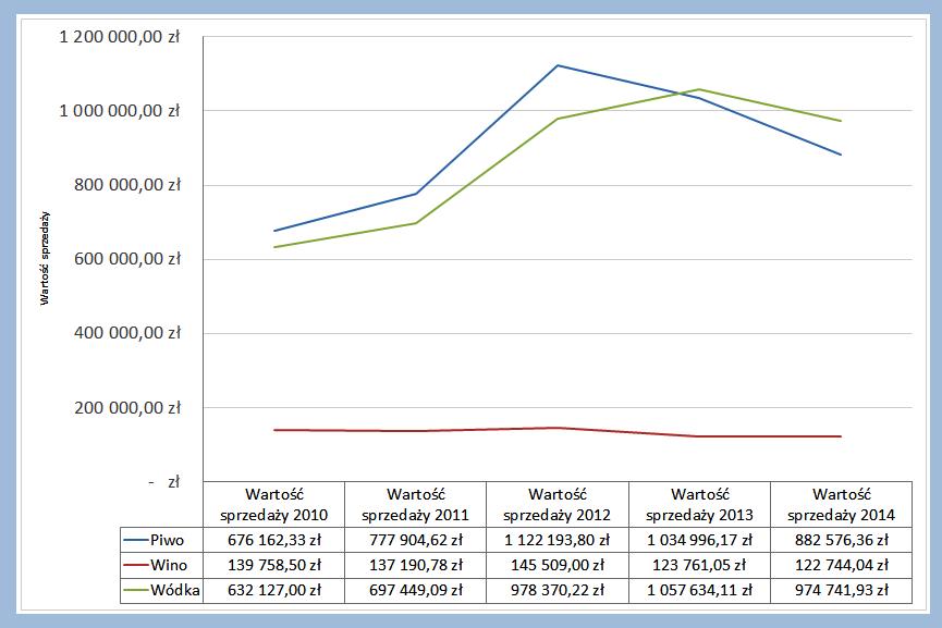 Podsumowując dane przedstawione przez przedsiębiorców za rok 2014 dostrzegamy powolny ale systematyczny spadek sprzedaży napojów alkoholowych na terenie Gminy Niwiska.