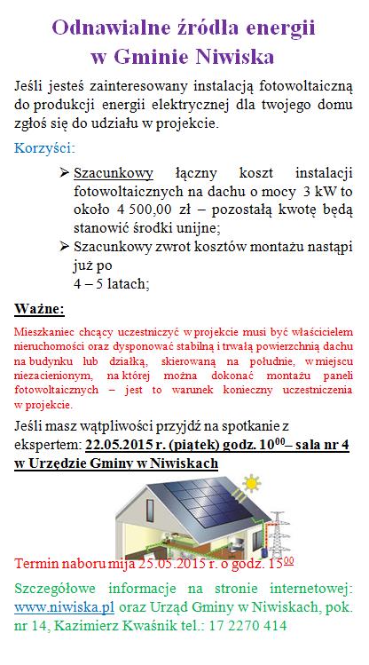 21 lipca 2015 r. Zarząd Województwa Podkarpackiego Uchwałą Nr 77/1740/15 zatwierdził listę operacji zakwalifikowanych do współfinansowania w ramach działania 321 „Podstawowe usługi dla gospodarki i ludności wiejskiej" objętego Programem Rozwoju Obszarów Wiejskich na lata 2007-2013, w zakresie operacji dotyczących budowy mikroinstalacji prosumenckich wykorzystujących odnawialne źródła energii, służących do wytwarzania energii, w szczególności energii elektrycznej lub cieplnej, z przeznaczeniem na potrzeby własne.