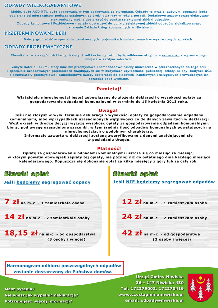 Wójt Gminy Niwiska informuje, że do 10 kwietnia 2013 roku pracownicy Urzędu Gminy przejdą po domach z deklaracjami dotyczącymi ustalenia opłaty za gospodarowanie odpadami komunalnymi, służąc pomocą ich wypełnienia.