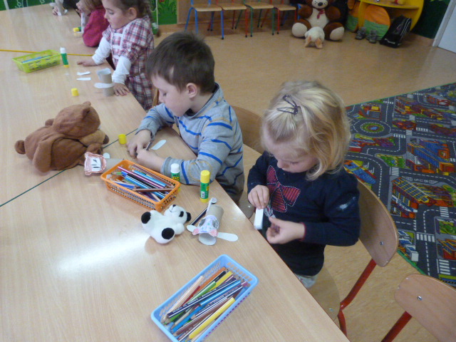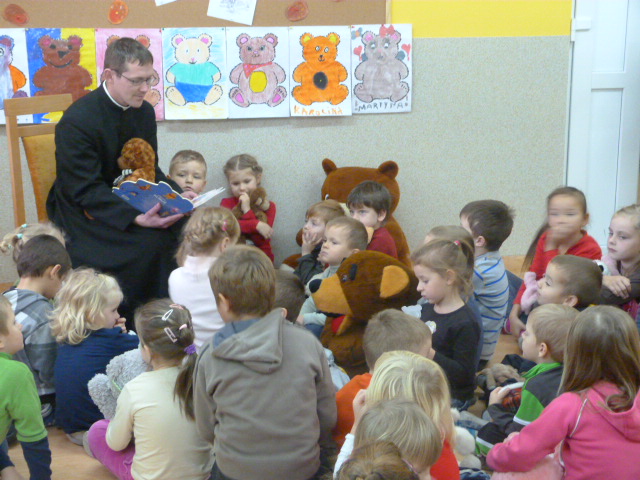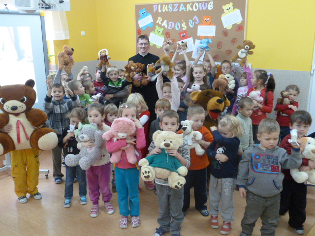 Obchody bowiem zaczęły się od misiowego tańca dzieci razem z ich maskotkami. Następnie zgromadzeni poznali historię pluszowego niedźwiadka, a także obejrzeli na tablicy interaktywnej zdjęcia najsławniejszych misiów, mając za zadanie wymienić ich imiona. Najważniejszymi postaciami byli tu najsławniejsi polscy bohaterowie wieczorynek - Colargol i Miś Uszatek, których wybrane przygody zebrani obejrzeli. Następnie dzieci nauczyły się wiersza o swoich przytulankach, a także rozwiązywały quizy. W tych ostatnich nagrodą była łyżka pysznego miodu - przysmaku każdego misia. Tuż po zabawie z "Niedźwiedziem w dużym, niebieskim domu", z którym dzieci poszukiwały różnych przedmiotów, a także tańczyły, dzieci rozdzieliły się. Uczniowie Szkoły Podstawowej, słuchając piosenek o misiach, mieli za zadanie wykonać w zespołach piękne prace plastyczne - najpierw ułożyć puzzle i dzięki temu odgadnąć ich bohatera, a następnie ozdobić rysunki. Przedszkolaki wykonały natomiast wspaniałe, kolorowe podobizny swoich pluszowych misiów z... rolki po papierze. Dzień pełen atrakcji podsumowały w przedszkolu zajęcia z warsztatów tanecznych - dzieci nauczyły się tańca do piosenki o żelkowym misiu, a następnie poprosiły do zabawy swoje pluszaki i wraz z nimi kołysały się do utworu "Misie-Patysie". Szczególnym gościem dnia był ks. Rafał Głowacki, który czytał dzieciom bajki o ich ulubionych niedźwiadkach.