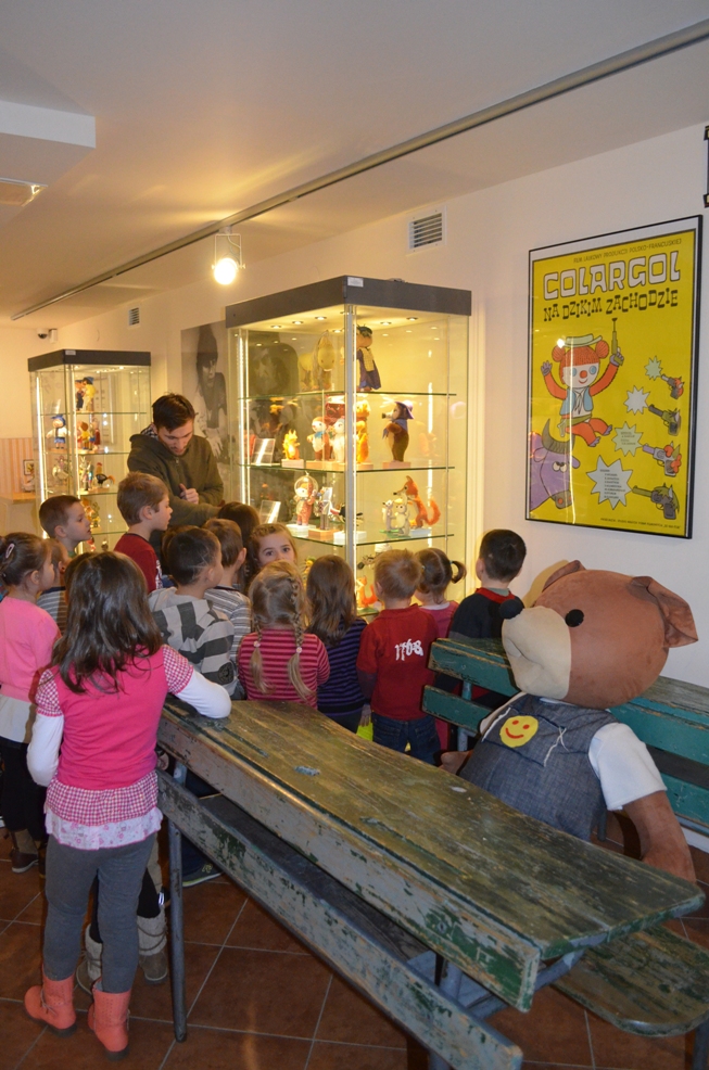 We wtorkowy poranek „Promyczki” z Punktu Przedszkolnego w Hucisku wybrały się do Muzeum Dobranocek w Rzeszowie. Dzięki panu przewodnikowi dzieci miały okazję przenieść się w świat polskiej bajki. Z ogromną ciekawością słuchały o najstarszej polskiej dobranocce „Jacku i Agatce”. Następnie oglądnęły lalki z filmów kukiełkowych produkowanych w Łódzkim Semaforze, oraz szkice, tła filmowe, a także zobaczyły wystawę dawnych modeli telewizorów, filmów na szpulach, kasetach i płytach. Szczególnym zainteresowaniem dzieci cieszyły się przedmioty będące niegdyś w powszechnym użytku ozdobione wizerunkami dobranockowych postaci: obrazy, tacki, talerze, budziki, a nawet lizaki. Na koniec dzieci oglądnęły projekcję kilku bajek tj. „Jacek i Agatka”, „Pik- Pok”, „Miś Uszatek”. Dzięki temu miały okazję poznać te postacie, które z pewnością bliskie są sercom mam, tatusiów a nawet babć i dziadków przedszkolaków. Wycieczka do Muzeum Dobranocek wywarła na dzieciach ogromne wrażenie.