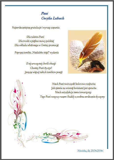 Bożeny Strzelec Loch - Prezesa Stowarzyszenia Kół Gospodyń Wiejskich Gminy Niwiska. W ten wyjątkowy wieczór dane było również i mi, wraz ze Stachem Ożogiem odkrywać na scenie Gminnego Ośrodka Kultury i Biblioteki w Niwiskach na powrót wersy wyobraźni Cecylii Lubach, gdyż dokonaliśmy wcześniej nagranie wyimków poetyckich pani Cecylii w formie fonicznej.