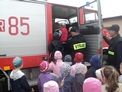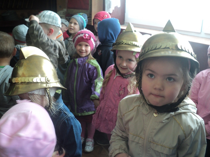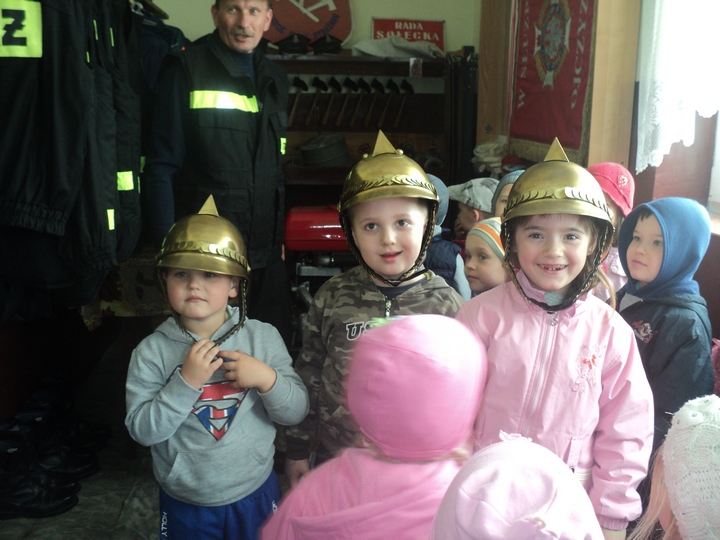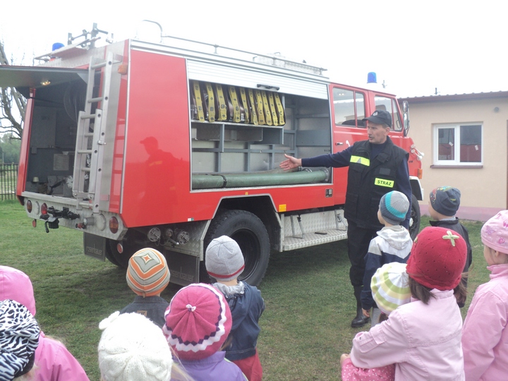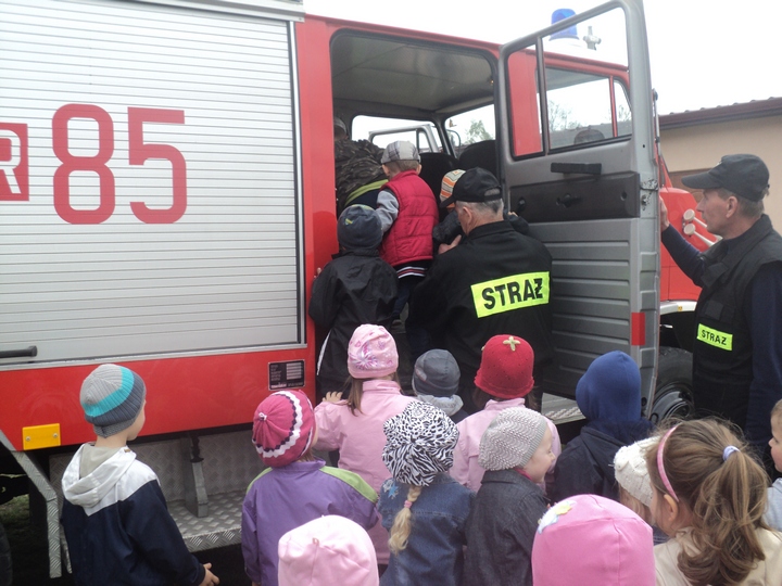 Dzieci zwiedziły pomieszczenie remizy, zapoznały się z ubraniami ochronnymi strażaków i ich wyposażeniem osobistym. Przy tej okazji dzieci miały okazję przymierzyć strażackie hełmy. Przyszła także pora na zaznajomienie się ze sprzętem strażackim - goście obejrzeli samochód i jego wyposażenie, mieli także możliwość sami spróbować swoich sił w posługiwaniu się tym sprzętem. Śmiechu i radości było co niemiara. Następnie dzieci z wielkim zainteresowaniem przyglądały się działaniom strażaków, kilku z przedszkolaków zapowiedziało, że gdy trochę podrosną to wstąpią w strażackie szeregi. Zwieńczeniem wizyty była oczywiście przejażdżka wozem strażackim! Tak wspaniałą i emocjonującą wycieczkę dzieci z pewnością będą długo pamiętać.