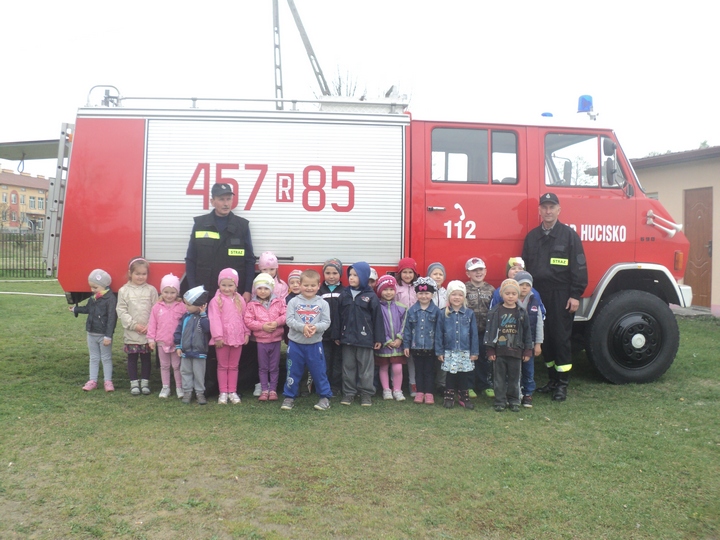 25 kwietnia 2014 roku dzieci z Punktu Przedszkolnego PROMYCZEK udały się z wizytą do Ochotniczej Straży Pożarnej w Hucisku, gdzie czekała na nie masa atrakcji! Mogły dokładnie przyjrzeć się jak wygląda wyposażenie remizy, wozu strażackiego i poznać tajniki pracy strażaka.