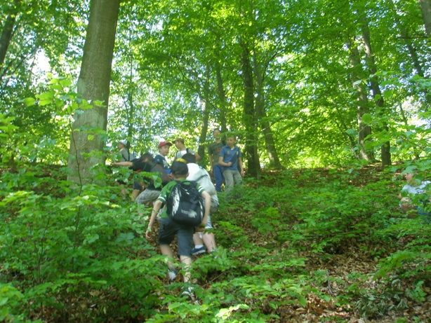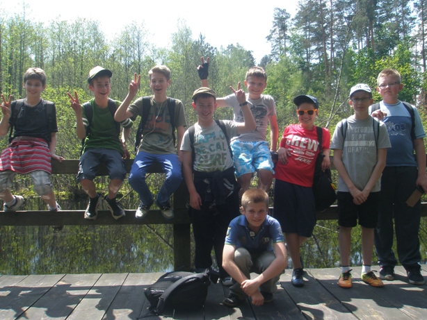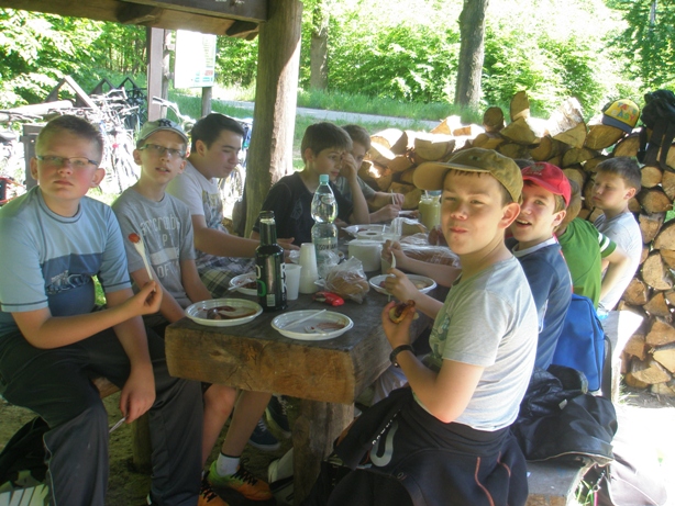 Pogoda była piękna, krajobrazy po drodze zachęcały do postojów, na których można było odpocząć, zaczerpnąć łyk wody i pokontemplować uroki przyrody. Po dotarciu na tzw. „Białkówkę” opiekunowie rozpalili ognisko i przygotowali zdrożonym wędrowcom posiłek – uczniowie w tym czasie bawili się i grali w piłkę. Po zjedzeniu kiełbaski z ogniska i podreperowaniu nadwątlonych sił, ruszyli w drogę powrotną, zbaczając nieco z trasy na tzw. czerwony szlak prowadzący do uroczego, leśnego oczka wodnego. Dla części grupy przebycie trasy po leśnych drogach okazało się nie lada wyzwaniem i zostało okupione dużym wysiłkiem fizycznym Pomimo różnych niedogodności wszyscy cało