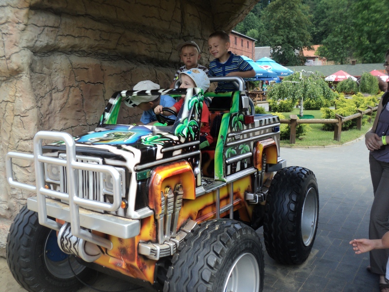 Oprócz drabinek, huśtawek, karuzel i zjeżdżalni dzieci mogły pobawić się w paleontologa i odkopać szkielet dinozaura. Następnie z uśmiechami na ustach rozpoczęło się zwiedzanie Bałtowskiego Parku Jurajskiego. Pierwszym punktem naszej wycieczki było kino emocji 5D. Krótki film przedstawiający powstanie ziemi zrobił na przedszkolakach wielkie wrażenie – szczególnie dodatkowe efekty: dźwiękowe, ruchowe i dotykowe. Potem udaliśmy się do miejscowego Parku Rozrywki gdzie dzieci wraz z rodzicami spędziły czas na świetnej zabawie.