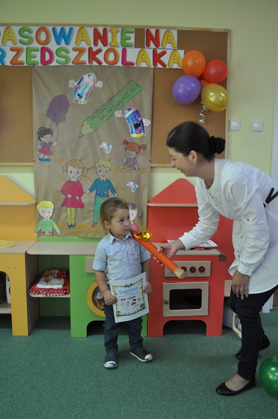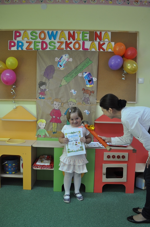 Pasowanie na przedszkolaka jest kolejnym etapem okresu adaptacji dziecka do nowych warunków.Od pierwszych dni pobytu dziecka w przedszkolu poczyniliśmy wiele starań ,aby pokonać stres i zapobiec negatywnym przeżyciom małego dziecka przy przekroczeniu progu przedszkola.Jesteśmy przekonani że dzieci mają poczucie bezpieczeństwa,a rodzice pewność że nasze przedszkole jest tym miejscem gdzie bez obawy mogą pozostawić swoje dziecko.