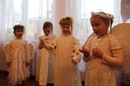 Przedszkolaki przebrane za pasterzy i aniołki ogłosiły wesołą nowinę narodzin Jezusa. Następnie wspólnie ze zgromadzonymi dziećmi i nauczycielami wyśpiewały kolędę „Pójdźmy wszyscy do stajenki”.