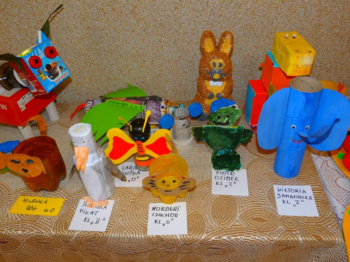 Z materiałów ekologicznych i surowców wtórnych powstały różnorodne ekozwierzaki z trudną głoską w nazwie, m.in. słoń z butelki z trąbą z nakrętek, jeż z wytłaczanek po jajkach, motyl z pojemnika po soli czy pszczółka z rolki po papierze toaletowym.