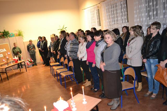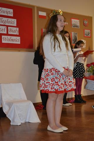 „Rozkwitają pąki białych róż…” śpiewali zgromadzeni goście 19.11.2015 r., a wraz z tymi słowami rozkwitały ich serca. W tym dniu mięliśmy zaszczyt gościć w naszej szkole p. wójt Elżbietę Wróbel, p. sekretarz Jolantę Marut oraz p. radnego Józefa Chmielowca. W uroczystości wzięli udział również rodzice uczniów, którzy przybyli w tym dniu na wywiadówkę. Po uroczystym przywitaniu gości przez p. dyrektor Krystynę Piątkowską rozpoczęliśmy uroczystość patriotyczną. Uczniowie ze starszych klas zaprezentowali przygotowaną inscenizację. Podczas spotkania został odśpiewany hymn narodowy: