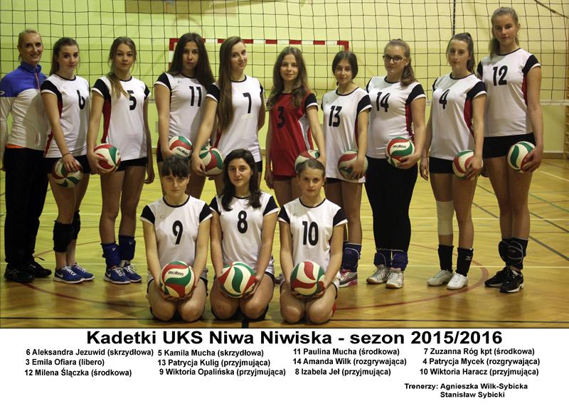 Kadetki UKS Niwa Niwiska sezon 2015/2016 rozpoczęły 26.09.2015r. pierwszym meczem z Olimpem Czudec wygrywając 2:1 w setach. Zawodniczki podczas dwóch rund trwających od września do listopada rozegrały 14 meczy. Turnieje odbywały się w kolejne soboty na wyjeździe albo w naszej miejscowości na hali sportowej. Dziewczyny rywalizowały w grupie z 7 zespołami zgłoszonymi do PWZPS w kategorii kadetek z rocznika 1999 i młodsze. Były to zespoły: Olimp Czudec, UKS MOSiR Jasło, UKS Gimnazjum Dębowiec, DAS Kępa Dębica I, DAS Kępa Dębica II, Developres SkyRes V LO Rzeszów, MKS MOS V LO Rzeszów. Były jeszcze 2 grupy liczące po 7 zespołów z całego podkarpacia. Pomimo krótkiego stażu ligowego zawodniczki Niwy prezentowały dobry poziom sportowy w wyniku czego zaczęły odnosić pierwsze sukcesy w rozgrywkach ligowych i turniejach towarzyskich. W wyniku dotychczasowych rozgrywek zawodniczki UKS będą kontynuowały rywalizację w grupie B o miejsca od VII do XXII gdyż tyle zespołów startowało w 3 grupach. Dalsza rywalizacja rozpocznie się w styczniu 2016r.