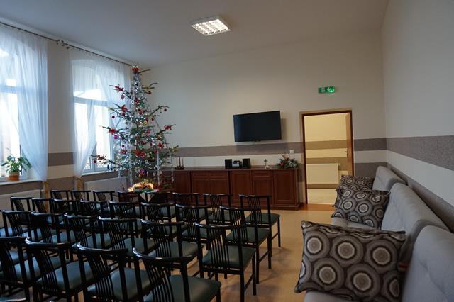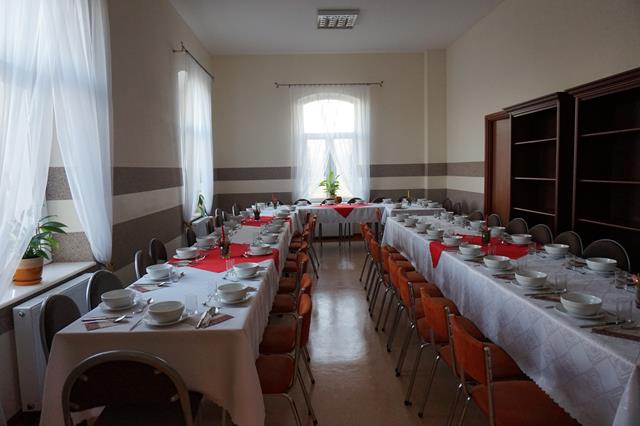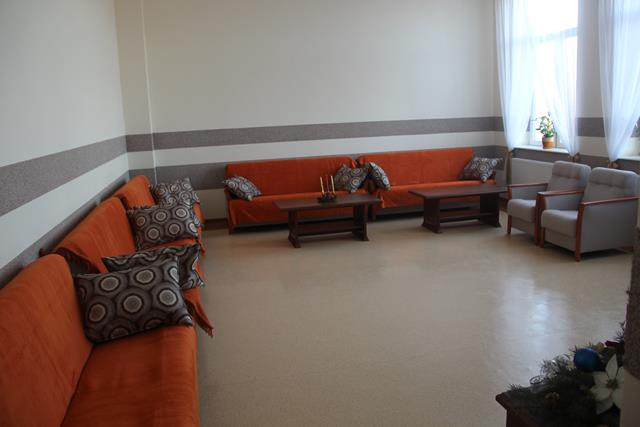 pomieszczenie ogólnodostępne wyposażone w stoły i krzesła pełniące funkcję sali spotkań, jadalni, podłogi wykonane z materiałów antypoślizgowych;