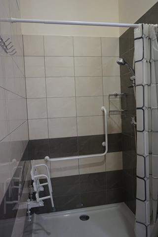 łazienkę wyposażona w 2 toalety (dla kobiet i mężczyzn), zapewniającą odpowiednią przestrzeń manewrową oraz wyposażoną w uchwyty przy toalecie, odpowiednio przystosowaną umywalkę i prysznic z krzesełkiem, uchwyty pod prysznicem,