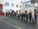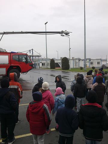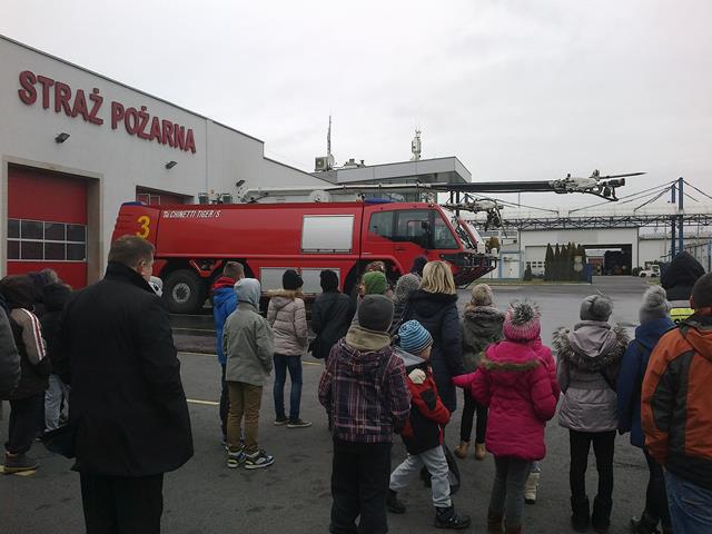 Uczniowie przeszli „odprawę celną”. Wszyscy mieli okazję przejść taką kontrolę przed wejściem na płytę lotniska, gdzie z kolei odbyło się spotkanie z przedstawicielami Lotniskowej straży Pożarnej. Największą atrakcją było zwiedzanie specjalistycznego wozu strażackiego.