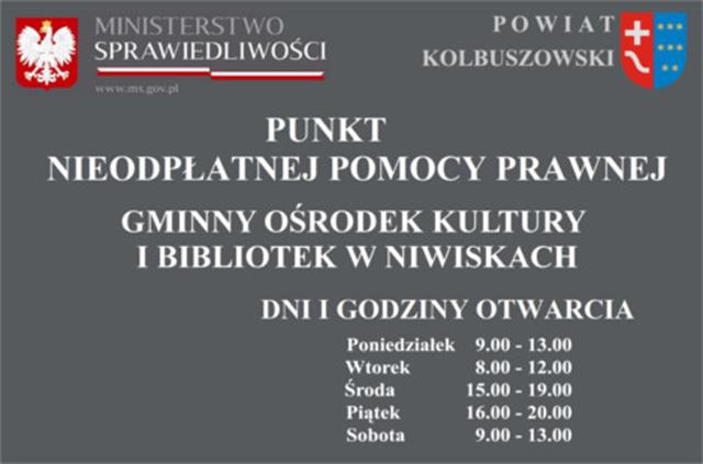 budynek Gminnego Ośrodka Kultury i Biblioteki w Niwiskach – poniedziałek w godzinach 9.00-13.00, wtorek w godzinach 8.00-12.00, środa w godzinach 15.00-19.00, czwartek w godzinach 16.00-20.00, piątek w godzinach 16.00-20.00. Nieodpłatna pomoc prawna świadczona będzie przez radców prawnych.