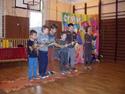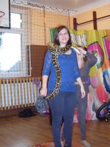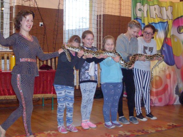 Artyści prezentowali swoje umiejętności w sztukach zręcznościowych, żonglerce oraz iluzji. Nie zabrakło „czarodzieja”, który z wielką wprawą rozśmieszał przedszkolaków i uczniów. Oglądaliśmy również pokaz tresury zwierząt - a dokładnie popisy pudelka, który bezbłędnie wykonywał polecenia swojej pani. Wiele emocji wzbudził wąż, którego uczniowie mogli dotknąć. Do zabawy były włączane też dzieci. Nasze odważne maluchy mogły sprawdzić się w wybranych sztuczkach cyrkowych. Umiejętności cyrkowców wszystkim bardzo się podobały, o czym świadczyły głośne brawa po każdym pokazie.