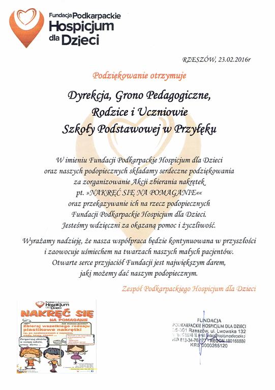 Szkoła Podstawowa w Przyłęku za przyłączenie się do akcji „NAKRĘĆ SIĘ NA POMAGANIE” i przekazanie zebranych nakrętek, dostała od Fundacji Podkarpackiego Hospicjum dla Dzieci serdeczne podziękowania i dyplom za udział w tej charytatywnej akcji.