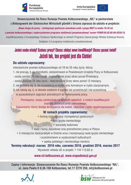 Stowarzyszenie Na Rzecz Rozwoju Powiatu Kolbuszowskiego „NIL” w partnerstwie z Bildungswerk der Sächsischen Wirtschaft gGmbH z Drezna realizuje projekt: „Nowa droga do pracy - reintegracja społeczno-zawodowa osób z grupy NEET w wieku 18-35 lat z powiatu kolbuszowskiego z wykorzystaniem programu mobilności ponadnarodowej” numer POWR.04.02.00-00-0258/15