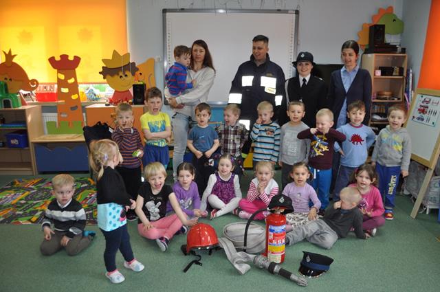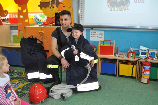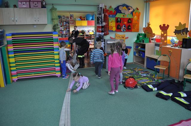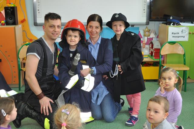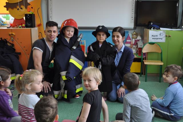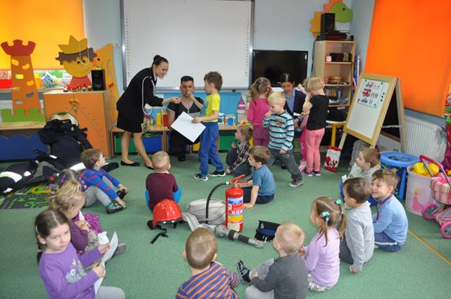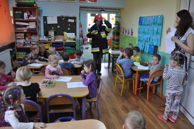W Przedszkolu Tęcza w Trześni odbyło się spotkanie ze strażakiem .W interesujący sposób dokonał prezentacji stroju strażaka oraz urządzeń używanych w trakcie akcji ratowniczej .Przeprowadził z dziećmi rozmowę na temat bezpiecznyh zasad zachowania w domu i w przedszkolu .W trakcie dyskusji panowała atmosfera prczepełniona emocjami ,dzieci chętnie zabierały głos .Przedstawiły numer alarmowy do straży pożarnej oraz omawiały tematy zagrożenia pożarami i innymi niebezpiecznymi zdarzeniami .Pan strażak przeprowadził przy udziale dzieci ćwiczenia pozorujące zagrożenie pożarem