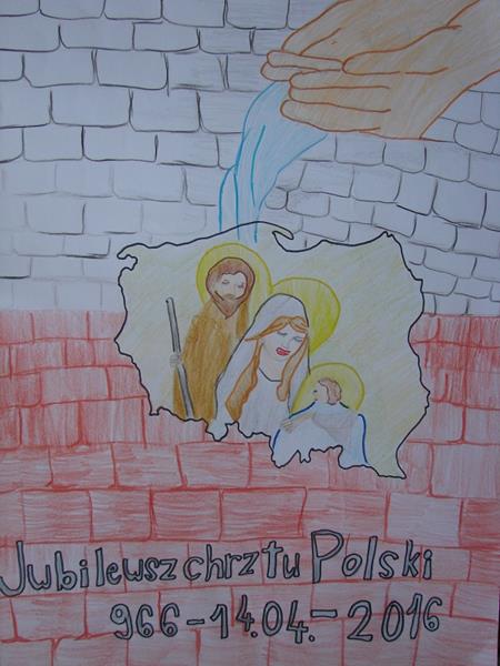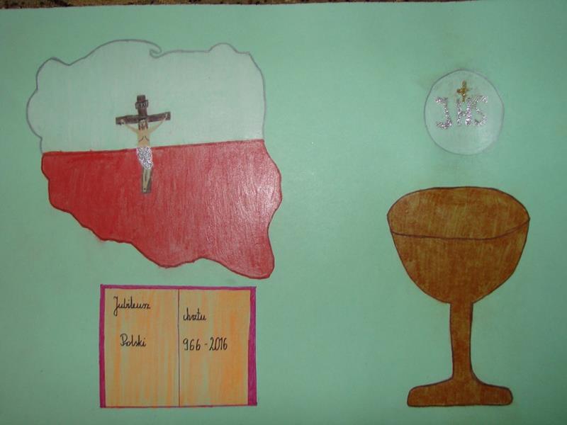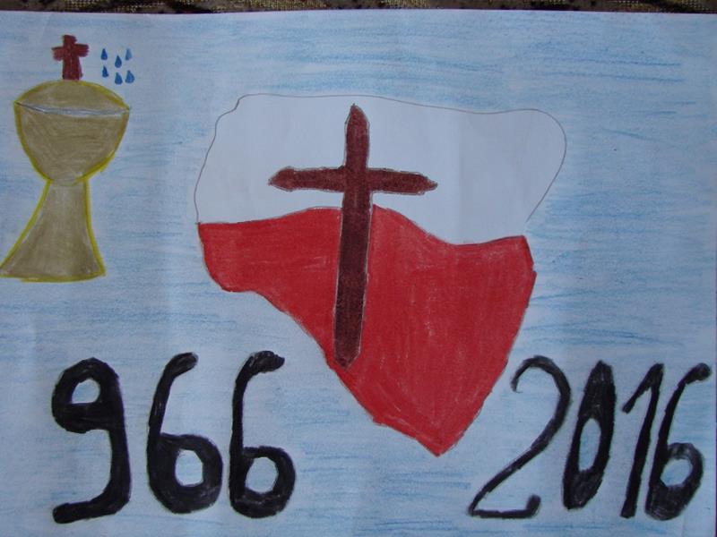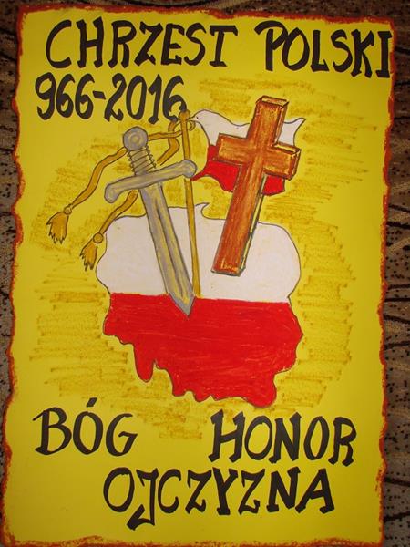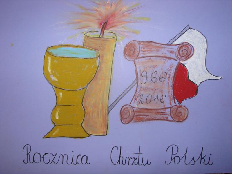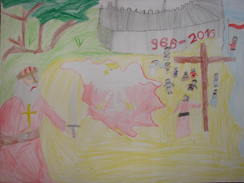 Uczniowie zaprezentowali prace plastyczne dotyczące 1050 rocznicy Chrztu Polski.