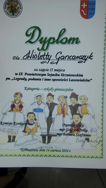 IX Sejmik Uczniowski pn. „Legendy, podania i opowieści Lasowiaków”. Celem Sejmiku jest pogłębianie więzi emocjonalnej ze swoją Małą Ojczyzną oraz wzbogacanie wiedzy uczniów na temat życia Lasowiaków. W konkursie biorą udział uczniowie gimnazjów i szkół ponadgimnazjalnych z terenu powiatu kolbuszowskiego. W tym roku wzięli w nim udział uczniowie z 4 gimnazjów: