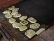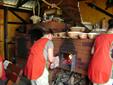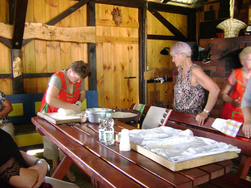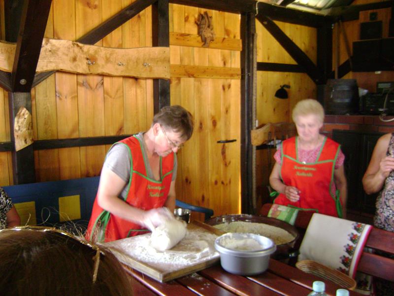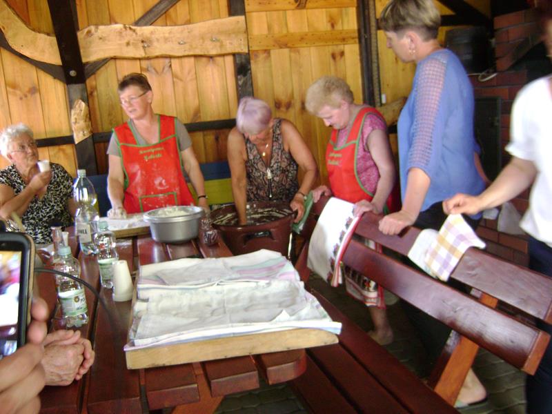 z Kołem Kobiet Kreatywnych z Trześni. Licznie zebrani widzowie mogli zobaczyć trudny proces wypieku chleba przedstawiony przez Panie; Marię Łakomy i Marię Kluk. Ewa Wójciak krótko streściła historie chleba, wymieniła rodzaje mąki i chlebków. W trakcie pieczenia chleba w piecu, Marta J. i Małgorzata Z. upiekły na blasze kuchennej i częstowały obecnych gości tradycyjnymi „broziokami”. Mogliśmy także spróbować „moskali”, tj. innych placków, również pieczonych na rozgrzanej blasze kuchennej, przygotowanych przez Czesławę M. i Marię S.
