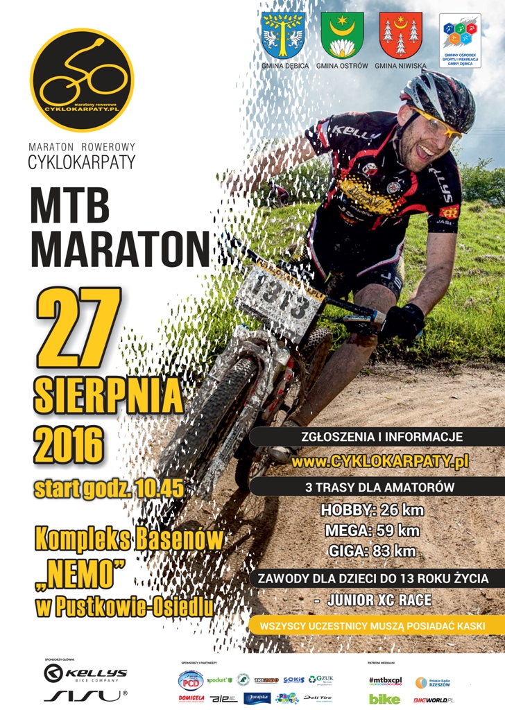 Wójt Gminy Dębica, Wójt Gminy Ostrów, Wójt Gminy Niwiska oraz Dyrektor Gminnego Ośrodka Sportu i Rekreacji Gminy Dębica serdecznie zapraszają wszystkich entuzjastów jazdy na rowerze do udziału w Maratonie Rowerowym „Cyklokarpaty”, który odbędzie się w dniu 27 sierpnia br., na terenach Gminy Dębica, Gminy Ostrów oraz Gminy Niwiska wraz z miasteczkiem zawodów na obiekcie Gminnego Ośrodka Sportu i Rekreacji Gminy Dębica – Kompleks Basenów „NEMO” w Pustkowie-Osiedlu.