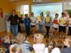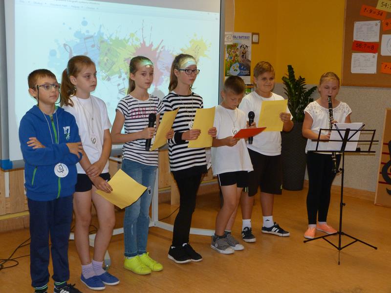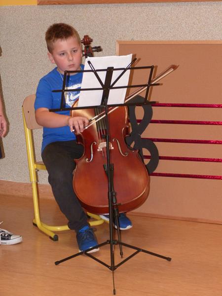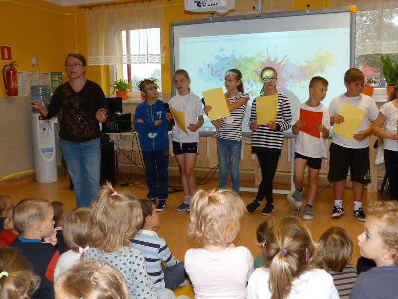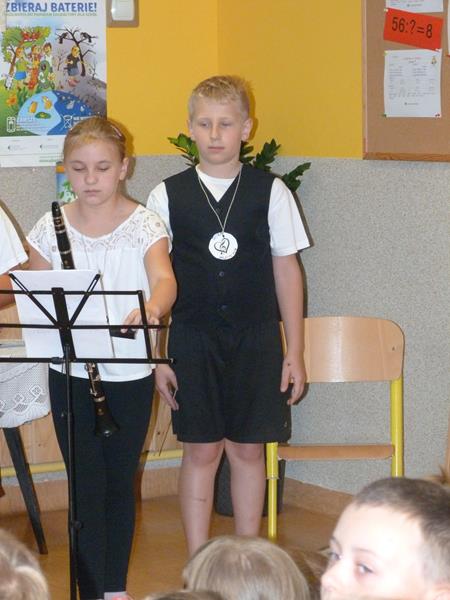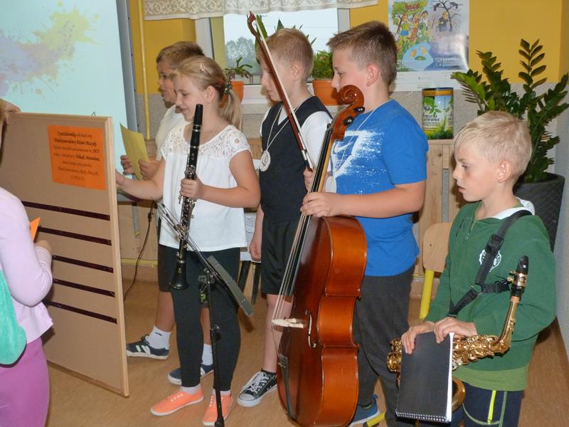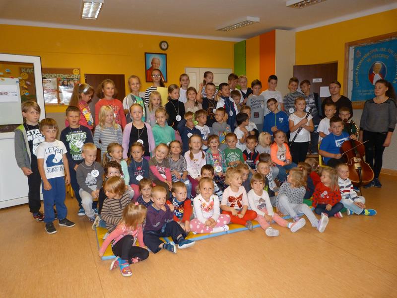 1 października obchodzimy Międzynarodowy Dzień Muzyki. Święto to zostało ustanowione w 1975 roku z inicjatywy Yehudi Menuhina, ówczesnego prezydenta Międzynarodowej Rady Muzyki UNESCO. Z tej okazji 3 października br. uczniowie klas III, IV i V Szkoły Podstawowej im. Św. Jana Pawła II pod opieką p. Sylwii Rauch przygotowali akademię, której towarzyszył niezwykły koncert w wykonaniu Martyny Magdy oraz Michała i Pawła Rydzych z kl. III i V. Uczniowie i przedszkolaki z Niepublicznego Przedszkola „Kraina Radości” uważnie wysłuchali bajki o nutach w filharmonii i o postaci dyrygenta. Następnie poznawali brzmienie instrumentów: klarnetu, wiolonczeli oraz saksofonu i odpowiadali na pytania ich dotyczące. Na pamiątkę obchodów każdy otrzymał pamiątkowy medalion, przygotowany przez uczniów kl. IV i V, oraz nutę, którą przedszkolaki ozdabiały, a starsze dzieci podpisywały i wieszały na gazetce na specjalnie przygotowanej pięciolinii. Na zakończenie uroczystości każdy mógł sobie zrobić pamiątkowe zdjęcie z artystami i ich instrumentami oraz poprosić o autograf.
