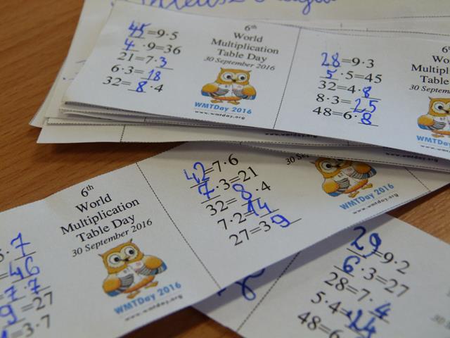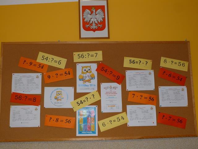 30 września 2016 r. obchodzony był VI Światowy Dzień Tabliczki Mnożenia (WMT day). Szkoła Podstawowa im. św. Jana Pawła II włączyła się w te szczególne obchody. Apel rozpoczynający matematyczną przygodę odbył się już 26 września. Uczniowie klas III, IV i V otrzymali podczas niego specjalny list do rodziców zapowiadający wszystkie wydarzenia Tygodnia z Tabliczką Mnożenia, poprzedzające piątkowe święto. Przedstawiono również na nim patrol egzaminacyjny, złożony z uczniów klasy II, którego zadaniem, w myśl hasła przewodniego obchodów "Młodsi sprawdzają, czy starsi tabliczkę mnożenia znają", było codzienne sprawdzanie aż do piątku, czy starsi koledzy potrafią mnożyć. Asystenci z w/w patrolu pomogli również przygotować specjalne plakaty zapraszające do świętowania VI Dnia Tabliczki Mnożenia. Oprócz kolorowych informacji i zaproszeń pojawiły się w całej szkole także dostarczone przez organizatorów WMT day barwne podpowiedzi, jak sobie poradzić z mnożeniem w pamięci większych liczb. Zaś 30 września na starszych uczniów czekała w szkole komisja egzaminacyjna, złożona z nauczyciela matematyki klas IV-V, p. Waldemara, oraz nauczycieli matematyki w edukacji wczesnoszkolnej, p. Agnieszki i p. Sylwii. Test ze znajomości tabliczki mnożenia odbył się na kartach egzaminacyjnych, przygotowanych specjalnie na ten dzień przez organizatorów. Według regulaminu obchodów po godzinie powtórzono egzamin dla osób, które nie poradziły sobie z poprzednim. Certyfikaty eksperta tabliczki mnożenia za bezbłędne wypełnienie testów otrzymało 13 osób spośród 24: 8 z klas IV-V oraz 5 z klasy III. Oprócz tego każdy uczestnik obchodów dostał pamiątkową naklejkę z tabliczką mnożenia. Swoje odznaki ekspertów przyznał również patrol egzaminacyjny. Codziennie przez 5 dni każdy uczeń otrzymywał od niego 3 matematyczne zagadki z zakresu tabliczki mnożenia do 100. Podstawą przyznania odznaki było wypełnienie tabelki odpowiedzi samymi plusami. Patrol wyposażony był w klepsydry, które pomagały odmierzać czas na odpowiedź. Na koniec szkolnego Tygodnia z Tabliczką Mnożenia również i uczniowie klasy II zostali nagrodzeni dyplomami asystentów i egzaminatorów.