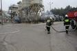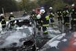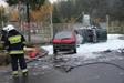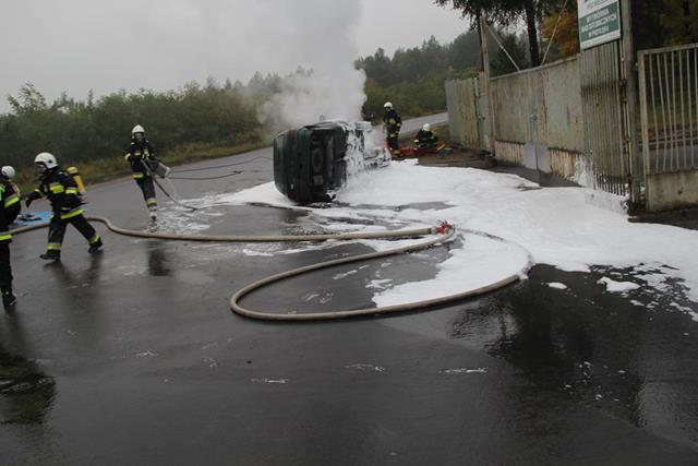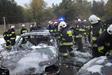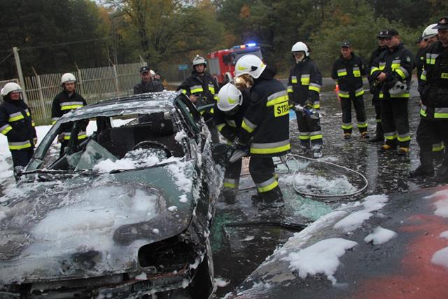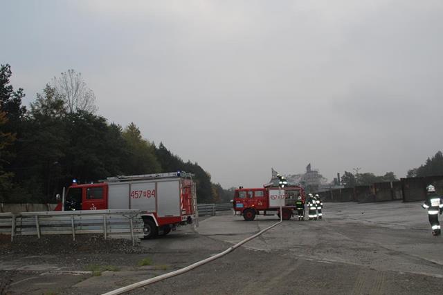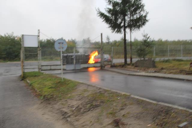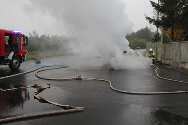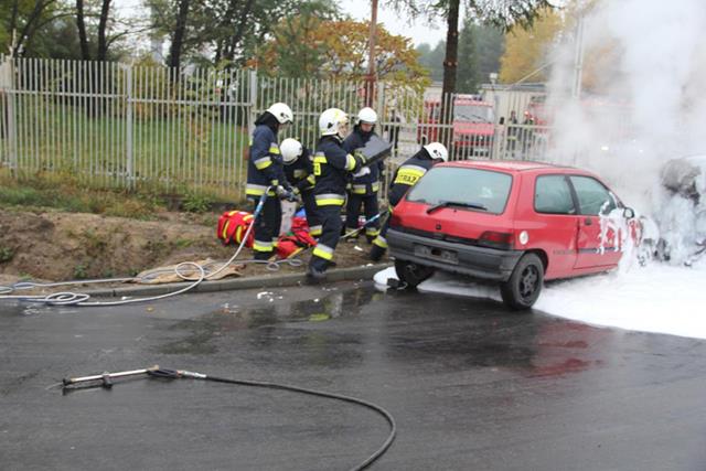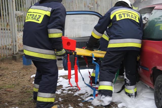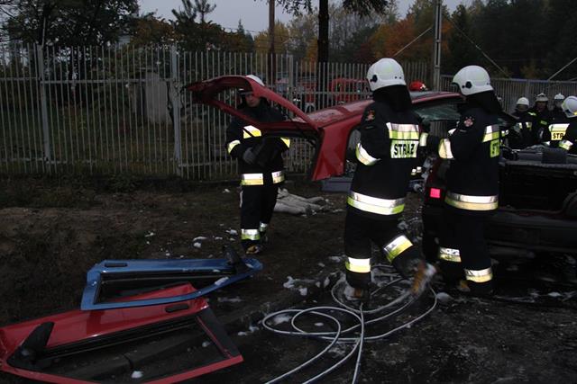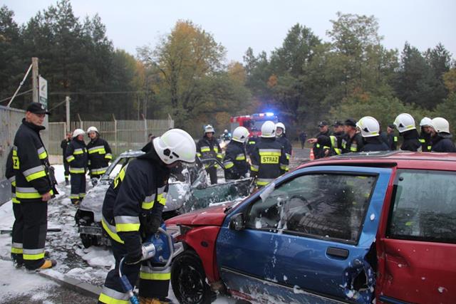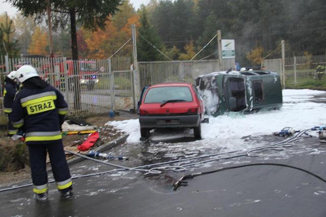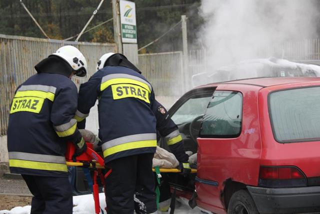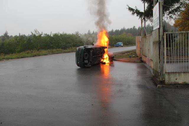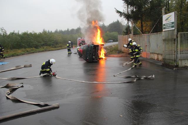 Podczas gaszenia pożaru na drodze powiatowej obok zakładu w trakcie manewru mijania (kierowcy obserwują akcję gaśniczą), dochodzi do czołowego zderzenia dwóch samochodów osobowych. W wyniku wypadku ranni zostają kierowcy i pasażerowie ( 4 osoby) a jeden z samochodów ulega zapaleniu.
