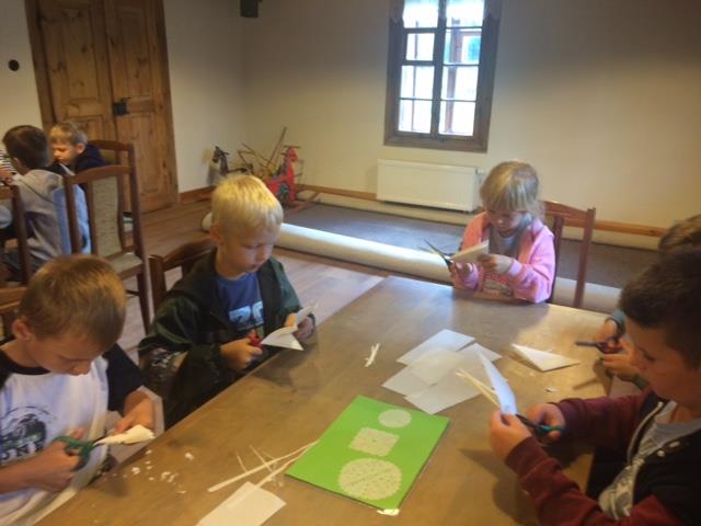 Śliczne wycinanki dokoła ściany „Ludowa wycinanka z papieru". Dzieci świetnie się bawiły zabawkami swoich dziadków a starsze uczyły się robić wycinanki które dawniej służyły do ozdoby pomieszczeń.