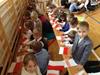 Następnie uczniowie dostali do wykonania dwa zadania. Jedno polegało na rozwiązaniu krzyżówki z wiedzy o Polsce, a drugie na ułożeniu z puzzli mapy Polski. Nasi najmłodsi uczniowie z klasy „0” otrzymali szczególne zadanie, było to pomalowanie kolorowanki z flagą i godłem Polski. Nad przebiegiem zadań czuwała komisja, na czele z Panią Dyrektor Krystyną Piątkowską.