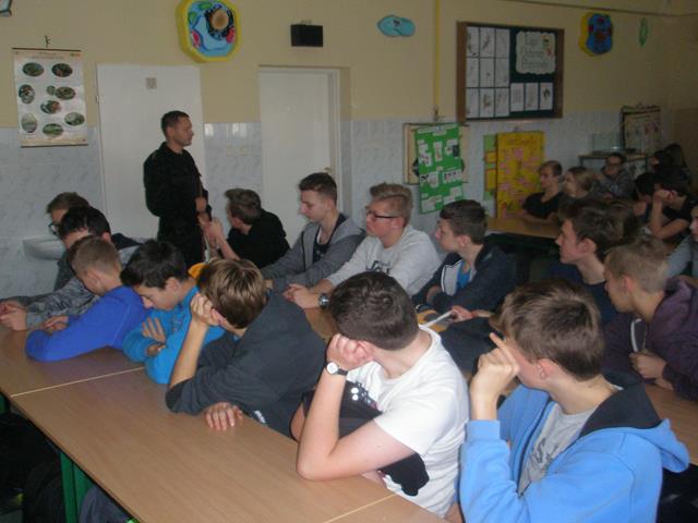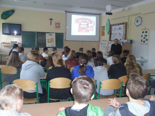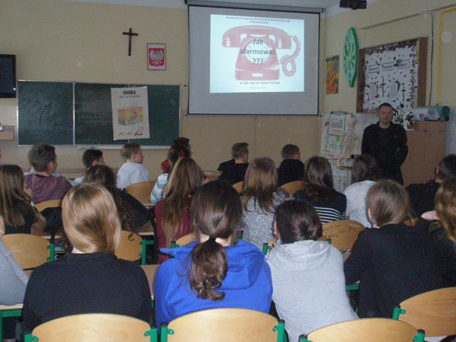 15 listopada uczniowie klas II i III uczestniczyli w spotkaniu edukacyjnym z przedstawicielem Komendy Powiatowej Państwowej Straży Pożarnej w Kolbuszowej. St. kpt mgr inż. Paweł Tomczyk w ramach projektu pn. „Czad i ogień. Obudź czujność” spotkał się z młodzieżą gimnazjalną w celu zapoznania ich (niektórym może tylko przypomnienia) zasad bezpieczeństwa oraz zachowania się w sytuacjach związanych z pożarem czy wydzielaniem się tzw. czadu. Przypomniał numery alarmowe oraz wyjaśnił znaczenie skrótów, jak np. CPR.
