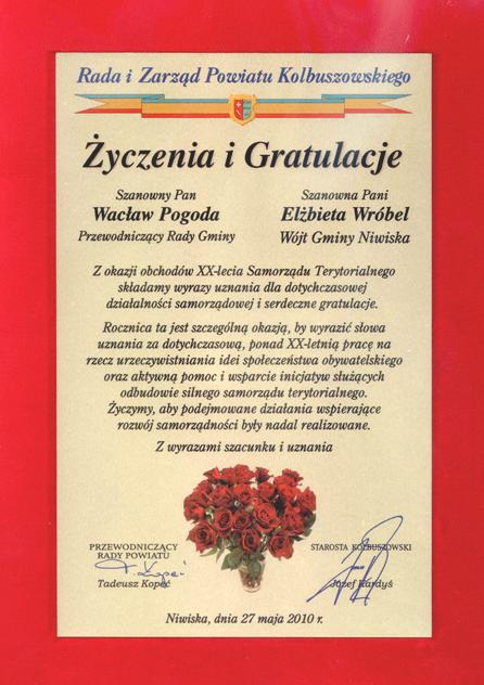27 maja 2010r. odbyła się uroczysta XL sesja Rady Gminy w Niwiskach poświęcona XX – leciu Samorządu Terytorialnego w Polsce.