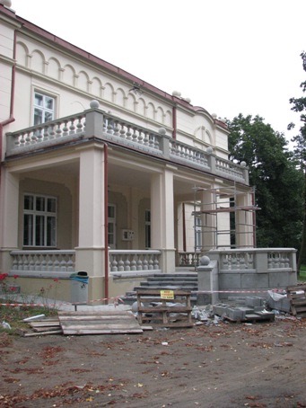 Trwają prace remontowo-konserwatorskie przy obiektach zabytkowych nieruchomych – w zespole pałacowo – parkowym, etap III, na wykonanie robót przygotowawczych, remontu schodów zewnętrznych, tarasu i wykonanie balustrad w Dworku Hupki. Wykonawcą (wyłonionym w przetargu nieograniczonym) jest Firma Remontowo – Budowlana Krzysztof Strzępka z Przyłęka, wartość zadania 101 521 zł.
