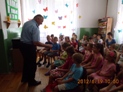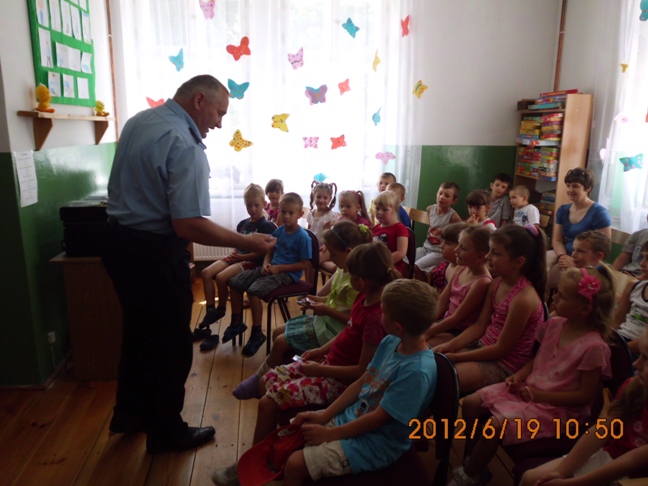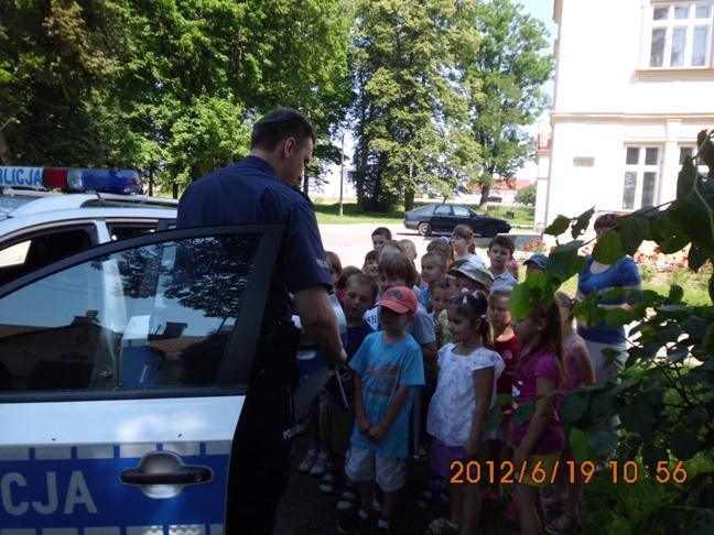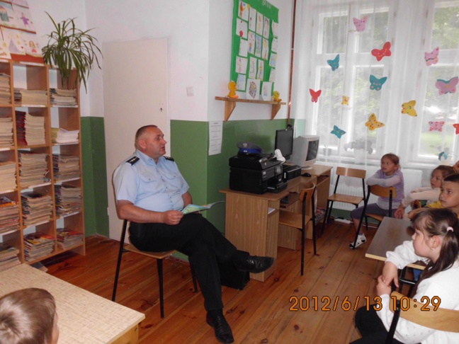 Podczas spotkania dzieci wysłuchały bajki Barbary Ciemskiej "Przez ulicę" czytanej przez Pana Komendanta, mogły też zdobyć wiele cennych informacji o bezpieczeństwie na drodze, a także jak zachować się zostając samemu w domu. Dodatkową atrakcją okazał się samochód policyjny, który dzieci z Oddziału Przedszkolnego przy Szkole Podstawowej mogły obejrzeć. Dzieci z ogromnym zaangażowaniem brały udział w spotkaniu, a także w rozmowie z zaproszonym gościem. Po wspólnej rozmowie dzieci wykonały rysunki, które wystawione są na tablicach w bibliotece.