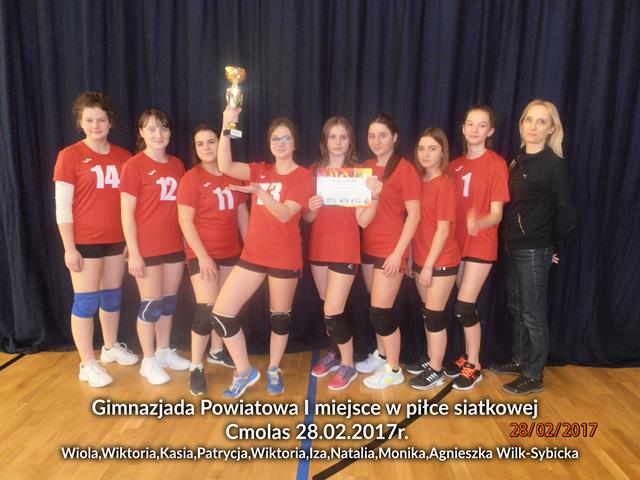 28.02.2017r. na hali sportowej w Cmolasie odbyła się Gimnazjada Powiatowa w piłkę siatkową. Uczennice naszego gimnazjum zajęły pierwsze miejsce i będą reprezentowały nasz powiat na zawodach rejonowych w drugiej dekadzie marca. W rywalizacji powiatowej wzięło udział 4 zespoły; z gimnazjum z Majdanu Królewskiego, z Trzęsówki, z ZS nr 2 w Kolbuszowej i z Niwisk.